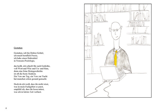 Am Anfang war der Reim. Dazu gesellte sich das Bild. So führt uns der Kinderdichter Doktor Krittel, alter ego seines Schöpfers, mit stets skeptischem Blick durch seinen Alltag der vergnüglichen Widersprüche. Er schlüpft dabei in viele Rollen: Vampir, Tänzer, Koch und Kapitän.